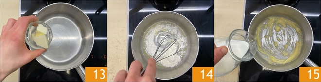 In der Zwischenzeit bereiten Sie das Fondue zu: Lassen Sie in einem Topf mit dickem Boden die Butter bei schwacher Hitze schmelzen 13, dann fügen Sie das Mehl hinzu und rühren Sie mit einem Schneebesen um 14, bis eine homogene Masse entsteht. Gießen Sie nach und nach die warme Milch hinzu 15.