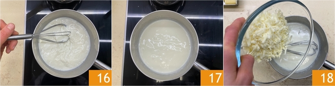 Rühren Sie weiter 16, bis die Bechamel glatt und gut eingedickt ist 17. Schalten Sie die Hitze aus und fügen Sie den geriebenen Asiago hinzu 18.
