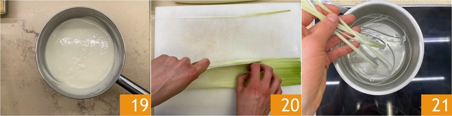 Rühren Sie, bis er vollständig geschmolzen ist 19. Nun schneiden Sie aus dem Lauch feine und gleichmäßige Fäden 20 und blanchieren Sie sie kurz in kochendem Wasser, um sie weich zu machen 21.