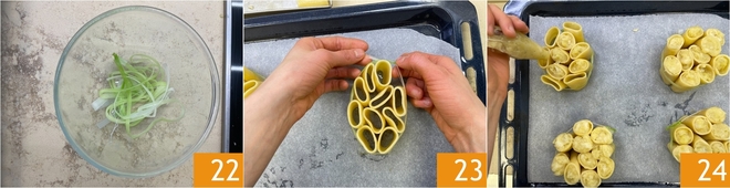 Lassen Sie die Stiele abtropfen und abkühlen 22. Sie sind bereit, das Gericht zusammenzustellen: Auf einem mit Backpapier ausgelegten Blech stellen Sie die Paccheri vertikal in 4 gleichmäßige Haufen von etwa 10 Stück. Binden Sie die Paccheri mit den Lauchstielen zusammen 23. Geben Sie die Kartoffel-Kabeljau-Füllung in einen Spritzbeutel ohne Tülle und füllen Sie die Paccheri bis zum Rand 24. Stellen Sie das Blech unter den Grill des Ofens und gratinieren Sie für etwa 5 Minuten.