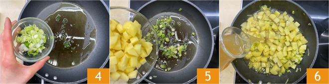 Erhitzen Sie einen Schuss Öl in einer großen Pfanne, fügen Sie die Frühlingszwiebel zusammen mit den Thymianblättern hinzu 4 und lassen Sie sie bei mittlerer Hitze sanft anschwitzen. Geben Sie die Kartoffeln hinzu 5, rühren Sie um, um sie zu würzen, und braten Sie sie kurz an, dann bedecken Sie sie mit der heißen Gemüsebrühe 6.