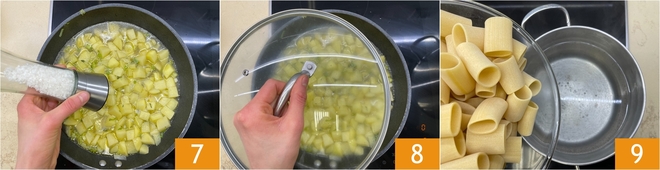 Salzen 7 und pfeffern Sie, decken Sie mit dem Deckel ab 8 und kochen Sie für etwa 15 Minuten. Bringen Sie nun reichlich Salzwasser zum Kochen und kochen Sie die Paccheri al dente 9, wobei Sie darauf achten, sie nicht zu zerbrechen.