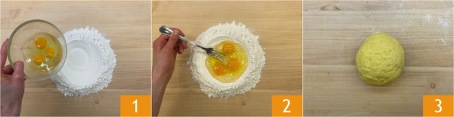 Um die gefüllten Pappardelle mit Kaninchenragout zuzubereiten, beginnen Sie mit der frischen Pasta. Auf einer Arbeitsfläche das Mehl als Brunnen anrichten 1, die Eier hineinschlagen, schnell verquirlen 2 und kneten, bis ein glatter und homogener Teig entsteht 3. Wickeln Sie ihn in Frischhaltefolie und lassen Sie ihn 30 Minuten im Kühlschrank ruhen.
