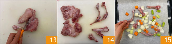 Die Kaninchenkeulen entbeinen 13, das Fleisch von den Knochen trennen 14. Letztere auf ein mit Backpapier ausgelegtes Blech zusammen mit in Stücke geschnittener Karotte, Sellerie und Zwiebel legen 15. Im Ofen bei 200°C für 20 Minuten rösten.