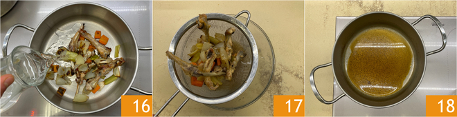 Alles in einen Topf mit etwas Öl geben, mit kaltem Wasser bedecken 16 und 30 Minuten kochen lassen. Durch ein Sieb abseihen 17 und den Kochfond um ¾ reduzieren 18. So erhalten Sie ein köstliches Kaninchenjus.