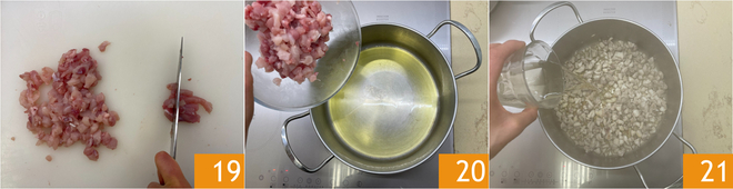 Das Fleisch in Würfel von einem halben Zentimeter schneiden 19 und in einen Topf mit etwas Öl geben 20. Ein paar Minuten anbraten und dann mit Weißwein ablöschen 21.