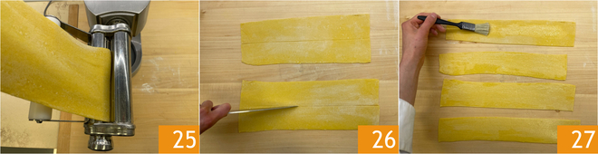 In der Zwischenzeit den Teig aus dem Kühlschrank nehmen und mit einer Nudelmaschine ausrollen 25. Die Teigbahnen der Länge nach halbieren 26. Die Pappardelle mit Wasser bestreichen 27.