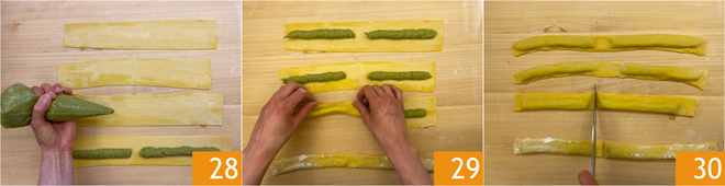 Mit einem Spritzbeutel die Erbsen-Guanciale-Mischung in die Mitte jeder Pappardelle spritzen, zwei Streifen von etwa 15 cm schaffen 28. Die Pasta zusammenklappen, die Ränder gut verschließen 29 und an den freigelassenen Stellen schneiden 30.