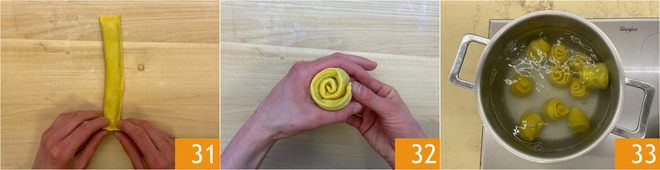 Jede Pappardella auf sich selbst aufrollen 31, um kleine Röllchen zu formen 32. In kochendem Salzwasser kochen 33.