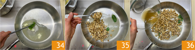 In einer Pfanne Butter schmelzen und den Salbei hinzufügen 34, das Kaninchenragout 35 und Kaninchenjus 36 dazugeben.