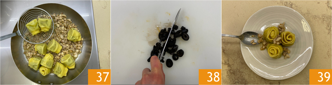 Die Pappardelle abseihen und zur Soße hinzufügen 37, 2-3 Minuten kochen, gerade so lange, dass sie Geschmack annehmen. In der Zwischenzeit die schwarzen Oliven mit dem Messer hacken 38. Zuerst die Pappardelle anrichten, dann das Kaninchenragout 39.