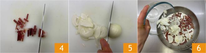In der Zwischenzeit den Guanciale in Streifen schneiden 4 und die Zwiebel in Scheiben 5. In einer Pfanne etwas Öl erhitzen, Guanciale und Zwiebeln hinzufügen 6. Auf niedriger Flamme einige Minuten anbraten.
