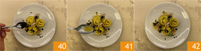 Die Oliven hinzufügen 40, einen Esslöffel Kaninchenjus 41 und einige frische Majoranblätter. Die gefüllten Pappardelle mit Kaninchenragout sind servierfertig 42.