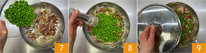 Die Erbsen hinzufügen 7, mit Salz und Pfeffer abschmecken 8. Die Pfanne mit einem Deckel abdecken 9 und 15 Minuten kochen lassen.