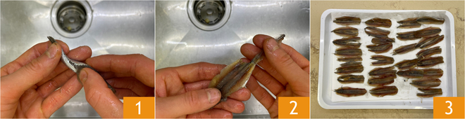 Um die gefüllten Sardellen in der Heißluftfritteuse zuzubereiten, legen Sie zunächst die Rosinen mindestens 10 Minuten lang in Wasser ein und widmen sich dann dem Wie man Sardellen (Anchovis) reinigt. Entfernen Sie den Kopf, drücken Sie leicht auf Höhe der Kiemen 1 und öffnen Sie die Sardellen wie ein Buch, dann entfernen Sie die Gräte 2 und die Eingeweide. Spülen Sie gründlich mit Wasser ab, um alle Verunreinigungen zu entfernen, und legen Sie die Sardellen beiseite 3.