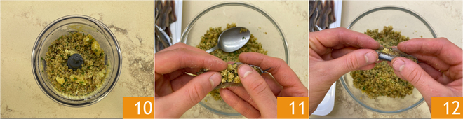 Mischen Sie, bis eine grobe Masse entsteht 10. Füllen Sie das Innere der Sardellen 11 und schließen Sie sie 12.