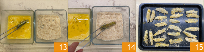 Wälzen Sie sie zuerst in Ei 13 und dann in Paniermehl 14 und legen Sie sie nach und nach auf ein Tablett 15.