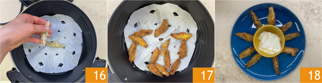 Legen Sie sie in den Korb der Heißluftfritteuse, der mit Backpapier ausgelegt ist 16, und backen Sie sie 15 Minuten lang bei 180°C 17, wobei Sie sie zur Hälfte der Garzeit wenden. Ihre gefüllten Sardellen in der Heißluftfritteuse sind bereit, heiß genossen zu werden 18!