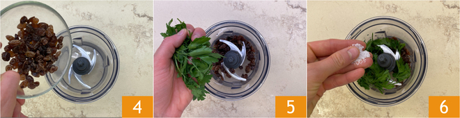 Für die Füllung geben Sie die Rosinen 4, die Petersilie 5 und das Salz 6 in einen Mixer.