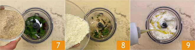 Fügen Sie auch das Paniermehl 7, den Pecorino 8 und das Öl 9 hinzu.