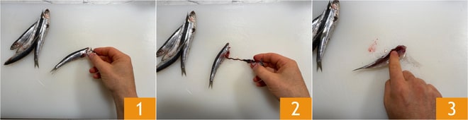 Um die gefüllten Sardellen zuzubereiten, beginnen Sie mit der Reinigung: Unter einem Wasserstrahl oder in einer Schüssel mit Wasser lösen Sie den Kopf 1, säubern das Innere 2 und erweitern vorsichtig die Öffnung mit dem Finger 3.