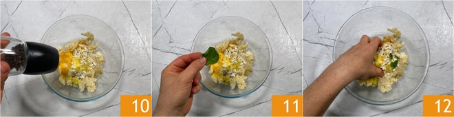Salzen, pfeffern 10 und mit zerkleinerten Minzblättern aromatisieren 11. Kneten Sie mit der Hand, um die Mischung gut zu vermengen 12.