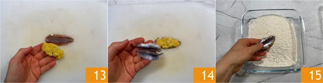 Legen Sie eine Sardelle nach der anderen mit der Haut nach unten auf die Arbeitsfläche, dann nehmen Sie eine kleine Portion der Füllung und drücken Sie sie auf die Handfläche, um sie bis zur gleichen Größe der Sardelle zu erweitern.13. Legen Sie eine andere Sardelle auf die Füllung, diesmal mit der Haut nach oben, wie ein Sandwich 14. Machen Sie so mit allen anderen Sardellen weiter. Wenn alle gefüllt sind, panieren Sie die gefüllten Sardellen, indem Sie sie zuerst in Mehl wenden 15.