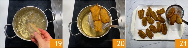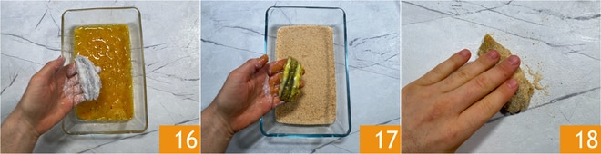 Tauchen Sie sie dann in die mit Salz und Pfeffer geschlagenen Eier 16 und schließlich in die Semmelbrösel 17. Nachdem Sie sie paniert haben, drücken Sie die gefüllten Sardellen vorsichtig, um sie zu formen 18.