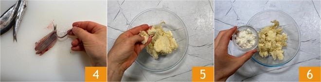 Entfernen Sie die zentrale Gräte 4, spülen Sie sie gut ab und legen Sie sie auf einem Teller offen wie ein Buch hin. Für weitere Details können Sie die Anleitung "Wie man Sardellen (Anchovis) reinigt" konsultieren. Jetzt kümmern Sie sich um die Füllung: Zerkleinern Sie das Brot von Hand 5, dann fügen Sie den geriebenen Pecorino hinzu 6.