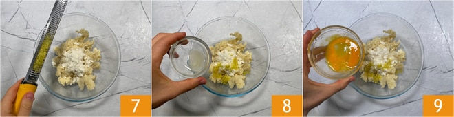 Fügen Sie auch die Zitronenschale 7, den Saft 8 und das Ei hinzu 9.