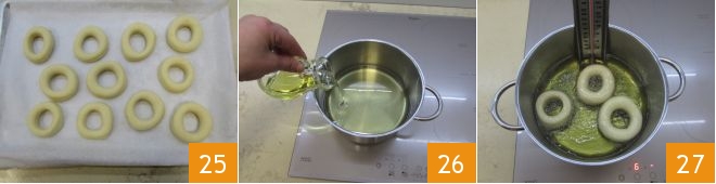 Lassen Sie die Krapfen mit Folie bedeckt bei Raumtemperatur fern von Zugluft oder immer im ausgeschalteten Ofen mit eingeschaltetem Licht für mindestens 1 Stunde gehen. Sobald die Krapfen ihr Volumen verdoppelt haben 25, geben Sie das Öl zum Frittieren in einen Topf 26 und erhitzen Sie es auf 170° (verwenden Sie ein Küchenthermometer, um die genaue Temperatur zu messen). Dann tauchen Sie 3-4 Krapfen auf einmal in das heiße Öl 27.