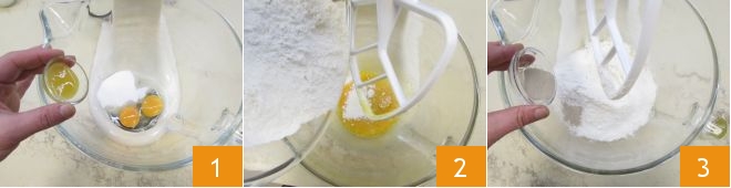 Um die frittierten Krapfen mit Schokoladencremefüllung zuzubereiten, beginnen Sie mit der Herstellung des Teigs. Geben Sie in die Schüssel einer Küchenmaschine mit Rührbesen die Eier, den Zucker und den Honig 1. Fügen Sie dann das gesiebte Mehl 2 und die Trockenhefe 3 hinzu.