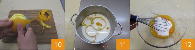 Bereiten Sie inzwischen die Schokoladencreme vor, die Sie zum Füllen Ihrer Krapfen benötigen. Schälen Sie die Orange 10 und geben Sie die Schale in einen Topf. Fügen Sie Milch und Sahne hinzu 11 und bringen Sie sie fast zum Kochen. Dann nehmen Sie den Topf vom Herd und lassen Sie ihn etwa 1 Stunde ziehen. In der Zwischenzeit hacken Sie die Schokolade fein und legen Sie sie beiseite. Brechen Sie die Eier und trennen Sie die Eiweiße von den Eigelben, fügen Sie den Zucker zu den Eigelben hinzu und schlagen Sie kräftig mit einem Schneebesen 12.
