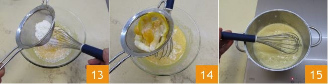 Sobald die Mischung hell und schaumig ist, fügen Sie das zuvor gesiebte Mehl und die Maisstärke hinzu 13 und rühren Sie schnell um. An dieser Stelle filtern Sie die Milch-Sahne-Mischung, halten Sie die Orangenschale zurück und fügen Sie die Flüssigkeit zu den restlichen Zutaten hinzu 14. Gießen Sie alles in einen Topf und stellen Sie ihn auf den Herd 15, rühren Sie weiter, bis Sie eine glatte und ausreichend dicke Mischung erhalten.