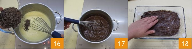Schalten Sie nun den Herd aus und fügen Sie die gehackte Schokolade hinzu 16, rühren Sie weiter, bis die Schokolade vollständig geschmolzen ist 17. Ihre Schokoladencreme ist nun fertig, geben Sie sie in eine Auflaufform, bedecken Sie sie mit Folie direkt auf der Oberfläche 18 und lassen Sie sie zuerst bei Raumtemperatur und dann im Kühlschrank abkühlen.
