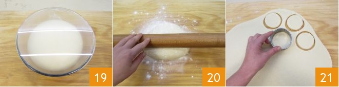 Nach der erforderlichen Zeit hat sich das Teigvolumen verdoppelt 19. Nehmen Sie es und legen Sie es auf ein leicht bemehltes Nudelbrett. Rollen Sie es mit einem Nudelholz aus 20, bis Sie eine Dicke von 1 cm erreicht haben, und stechen Sie mit einem Ausstecher mit einem Durchmesser von 7,5 cm Kreise aus 21.