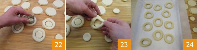Entfernen Sie vorsichtig den restlichen Teig zwischen den verschiedenen Kreisen und stechen Sie sie mit einem Ausstecher von 3,5 cm Durchmesser erneut aus, um das klassische Loch zu schaffen 22; vergrößern Sie es dann leicht mit den Händen 23 und legen Sie jeden Krapfen auf ein mit Backpapier ausgelegtes Backblech, wobei Sie sie voneinander entfernt platzieren 24. Um den restlichen Teig wiederzuverwenden, kneten Sie ihn einfach einige Minuten lang mit den Händen, lassen Sie ihn etwa 30 Minuten ruhen und rollen Sie ihn dann erneut aus, um weitere Krapfen herzustellen.