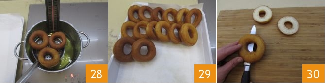 Frittieren Sie Ihre Krapfen etwa 2-3 Minuten lang, indem Sie sie nur einmal umdrehen. Nehmen Sie sie mit einem Schaumlöffel aus dem Öl 28 und legen Sie sie auf ein mit Küchenpapier ausgelegtes Tablett 29, um das überschüssige Öl zu entfernen. Nachdem alle Krapfen frittiert sind, schneiden Sie sie mit einem scharfen Messer in der Mitte auf 30.