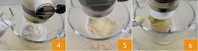 Schalten Sie die Maschine ein, fügen Sie auch nach und nach die Milch bei Raumtemperatur hinzu 4 und zuletzt eine Prise Salz. Arbeiten Sie die Zutaten weiter, bis der Teig homogen ist. Ersetzen Sie den Rührbesen durch den Knethaken und kneten Sie weiter 5, wenn der Teig sich um den Haken gewickelt hat, fügen Sie ein Stück weiche Butter 6 nach dem anderen hinzu und warten Sie, bis sie vollständig aufgenommen ist, bevor Sie das nächste hinzufügen!