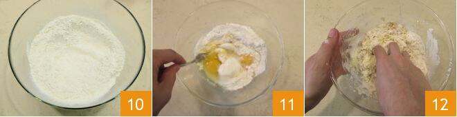 Nun fahren Sie mit der Zubereitung des frischen Nudelteigs fort. Nehmen Sie eine Schüssel und geben Sie das gesiebte Mehl hinein 10. Formen Sie aus dem Mehl einen Brunnen, machen Sie eine kleine Vertiefung in der Mitte und geben Sie die Eier hinein 11, würzen Sie mit einer Prise Salz. Beginnen Sie, die Zutaten zu vermischen, indem Sie nach und nach Mehl zu den Eiern einarbeiten und so den Kreis erweitern 12. Sobald alle Zutaten vermischt sind, legen Sie den Teig auf eine Arbeitsfläche. Arbeiten Sie den Teig mit den Händen mindestens 10 Minuten lang, bis ein weicher und homogener Teig entsteht.