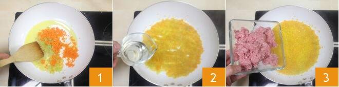 Um die gefüllten Tagliatelle zuzubereiten, beginnen Sie mit dem Eiernudelteig (Sie können das Rezept Frische Eiernudeln (Teig und Formate)): Geben Sie das Mehl auf eine Arbeitsfläche in die klassische Form eines Brunnens. Setzen Sie die Eier in die Mitte, fügen Sie das Salz hinzu und beginnen Sie, von außen nach innen zu kneten, wobei Sie das gesamte Mehl auf der Arbeitsfläche einarbeiten. Sie sollten den Teig mit Geduld und Energie bearbeiten, bis eine glatte und kompakte Masse entsteht. Wickeln Sie den fertigen Teig in Frischhaltefolie ein und lassen Sie ihn etwa 1 Stunde an einem kühlen und trockenen Ort ruhen. In der Zwischenzeit bereiten Sie ein Soffritto aus Sellerie, Zwiebel und Karotte zu, indem Sie diese fein gehackten Gemüse mit etwas Olivenöl extra vergine anbraten 1 (für eine ausführliche Anleitung zum Soffritto klicken Sie Wie man das Soffritto macht; falls nötig, fügen Sie während des Bratens etwas Wasser hinzu, damit nichts anbrennt 2. Sobald das Gemüse gut angebraten ist, geben Sie das Hackfleisch hinzu und braten es bei hoher Hitze 5 Minuten lang 3,