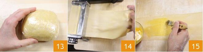 Formen Sie eine Kugel, die Sie mit Frischhaltefolie einwickeln 13. Nehmen Sie nun den Eiernudelteig und rollen Sie ihn mit einem Nudelholz aus, um zwei möglichst dünne Teigblätter zu erhalten, die Sie mit einer Nudelmaschine ausrollen 14. Bestreichen Sie die beiden Teigblätter mit dem verquirlten Ei (dies dient dazu, die Füllung besser haften zu lassen) 15,