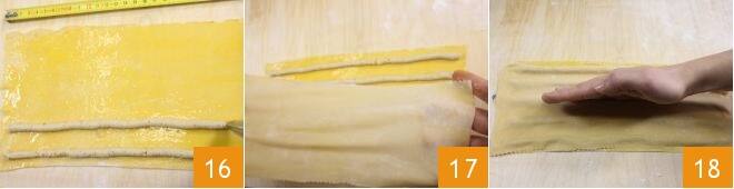 nehmen Sie dann den Spritzbeutel und verteilen Sie die Füllstreifen, die etwa 30 cm lang sind und einen Abstand von etwa 1 cm zueinander haben 16. Lassen Sie außerdem am oberen und unteren Rand einen Abstand von etwa einem halben Zentimeter, der zum Verschließen der Tagliatelle dient. Nehmen Sie das zweite Blatt Eiernudelteig und legen Sie es auf das erste 17. Es ist wichtig, dass die Tagliatelle verschlossen werden, ohne Luft im Inneren zu lassen, also drücken Sie mit der Hand an den Seiten der Füllung, um sie zu versiegeln und die gesamte Luft herauszudrücken 18.