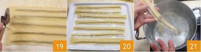 Jetzt schneiden Sie die Tagliatelle mit einem gezackten Teigrad 19, legen Sie sie dann auf ein leicht bemehltes Tablett 20. In der Zwischenzeit bringen Sie reichlich Salzwasser zum Kochen und kochen Sie die Tagliatelle 4-5 Minuten lang, dann seihen Sie sie ab und stellen Sie sie beiseite 21.