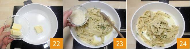 Lassen Sie in einer Antihaftpfanne die Butter schmelzen 22 und fügen Sie die gefüllten Tagliatelle hinzu: Braten Sie sie ein paar Minuten an und würzen Sie sie, indem Sie eine Mischung aus aromatischen Kräutern (Thymian, Oregano, Schnittlauch und Salbei) und reichlich Parmigiano Reggiano 23 hinzufügen. Rühren Sie vorsichtig, um die gefüllten Nudeln nicht zu brechen und alle Zutaten zu mischen, dann servieren Sie die gefüllten Tagliatelle noch heiß 24.