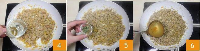 löschen Sie es dann mit Weißwein ab 4. Fügen Sie dem Fleisch einen gehackten Rosmarin hinzu 5 und nach und nach die Brühe 6, würzen Sie mit Salz und Pfeffer und lassen Sie es bei mittlerer Hitze etwa 40 Minuten kochen.