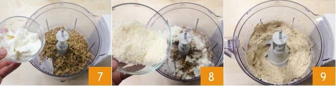 Wenn das Fleisch fertig ist, lassen Sie es abkühlen, dann geben Sie es zusammen mit dem Ricotta 7 und dem Parmigiano Reggiano 8 in einen Mixer. Mixen Sie alles 9 und geben Sie die Masse in einen Spritzbeutel mit kleiner, glatter Tülle.