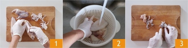 Um die gefüllten Calamari aus dem Ofen zuzubereiten, kümmern Sie sich zuerst um die Reinigung der Calamari. Entfernen Sie Kopf und Flossen. Entfernen Sie Augen und Schnabel vom Kopf und entfernen Sie die Haut von den Tentakeln und dem Körper 1. Nachdem Sie alles gründlich abgespült haben 2, schneiden Sie sowohl die Flossen als auch die Tentakel in kleine Stücke 3, lassen Sie den Beutel jedoch ganz.