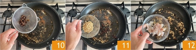 Fügen Sie die gut abgetropften Rosinen hinzu 10 und die Pinienkerne 11. Schließlich fügen Sie die Calamari in kleinen Stücken hinzu 12 und lassen Sie sie ein paar Minuten anbraten.