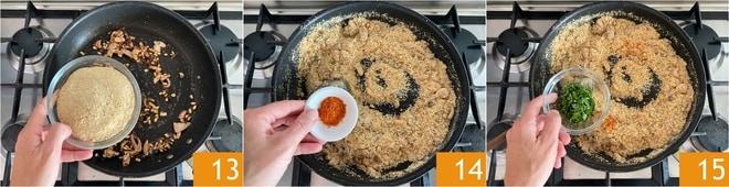 Schalten Sie die Hitze aus und fügen Sie das Paniermehl hinzu 13, würzen Sie dann mit Salz, einer Prise Chili 14 und reichlich gehackter Petersilie 15.